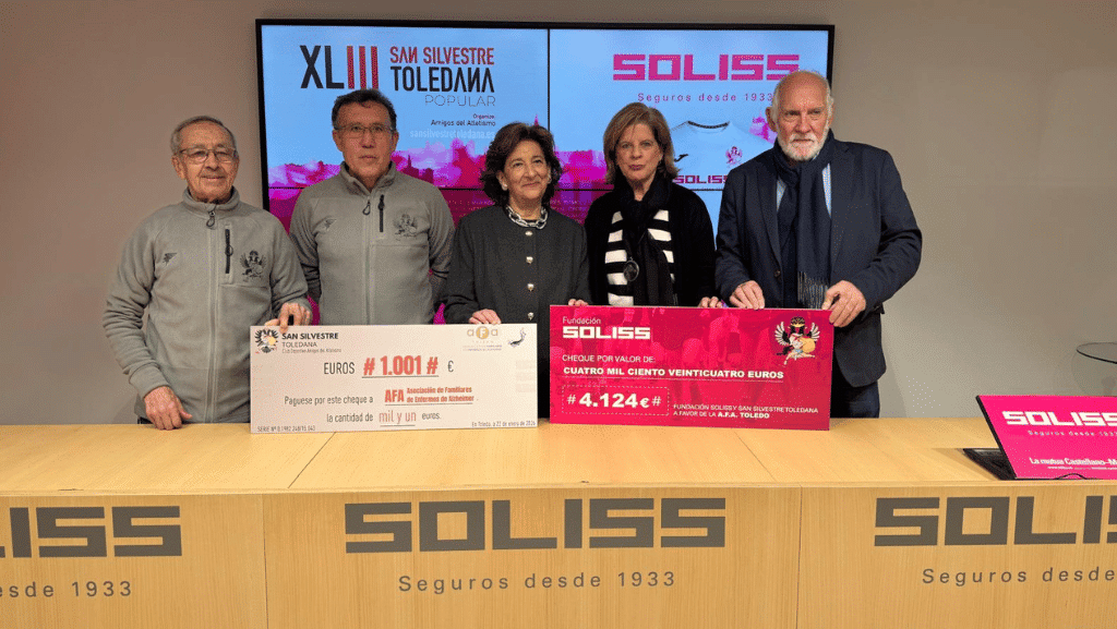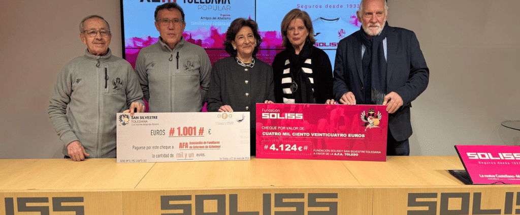 La Fundación Soliss ha hecho entrega de un donativo de 4.124 euros a AFA (Asociación de Familiares de Enfermos de Alzheimer de Toledo), una cantidad que se corresponde con un euro por cada corredor y corredora que finalizó la 43ª edición de la San Silvestre Toledana Popular, celebrada el pasado 31 de diciembre.